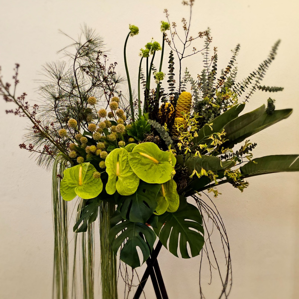 A vibrant and eye-catching standy arrangement with tropical flowers & exotic foliage! Bring a burst of green and a sense of lush, exotic beauty & freshness. Suite for those prefer green & freshness.