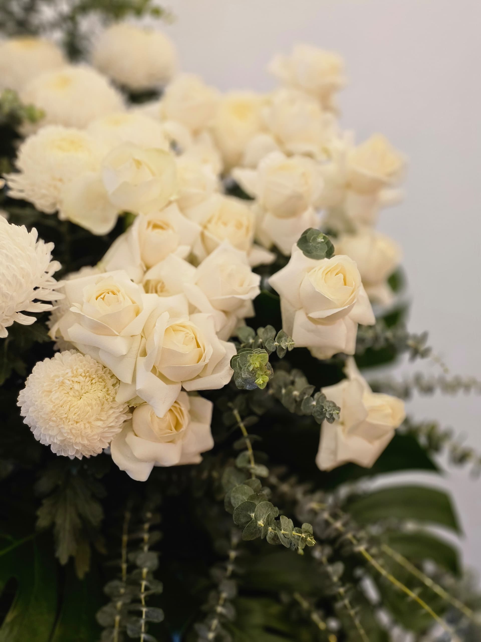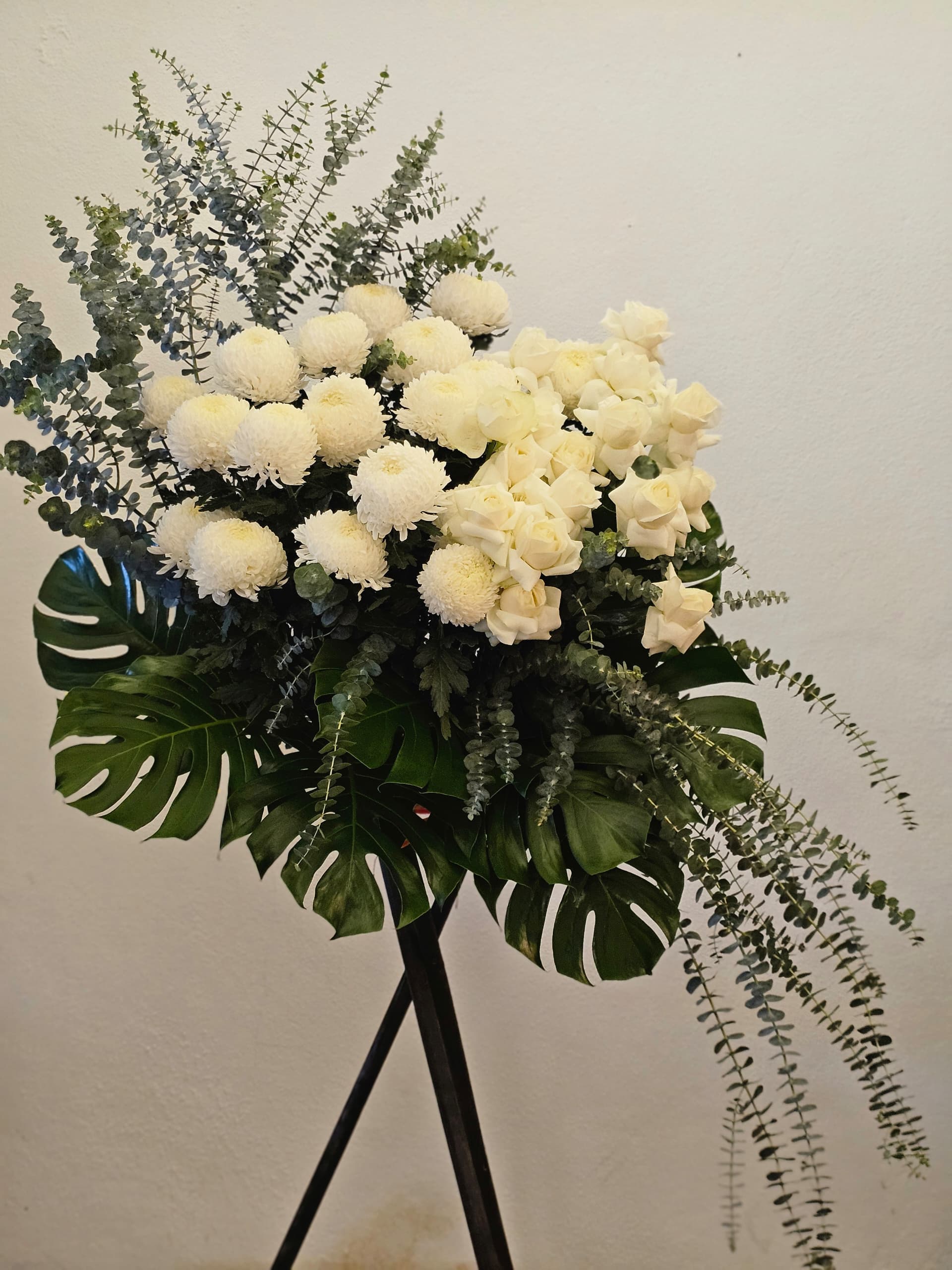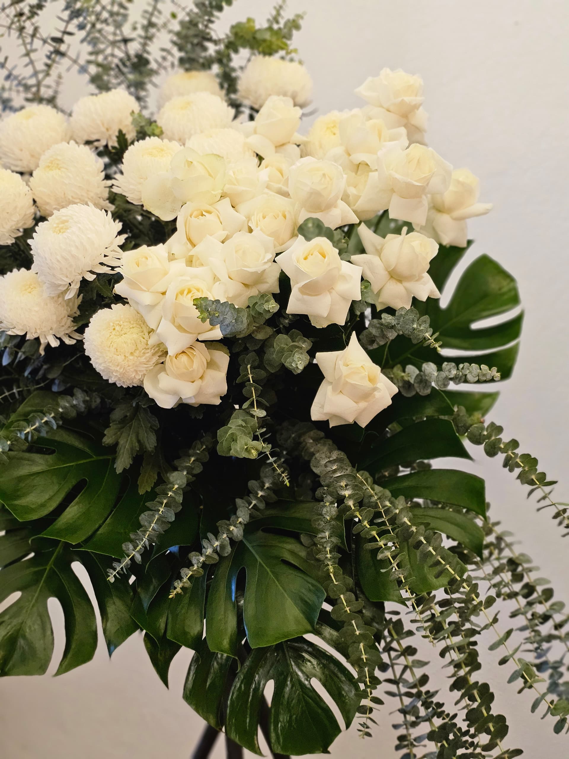 A simple flower stand featuring white chrysanthemums and white roses as a remembrance could be a beautiful and understated tribute. White chrysanthemums symbolize truth, honesty, and long life, while white roses often represent purity, remembrance, and reverence