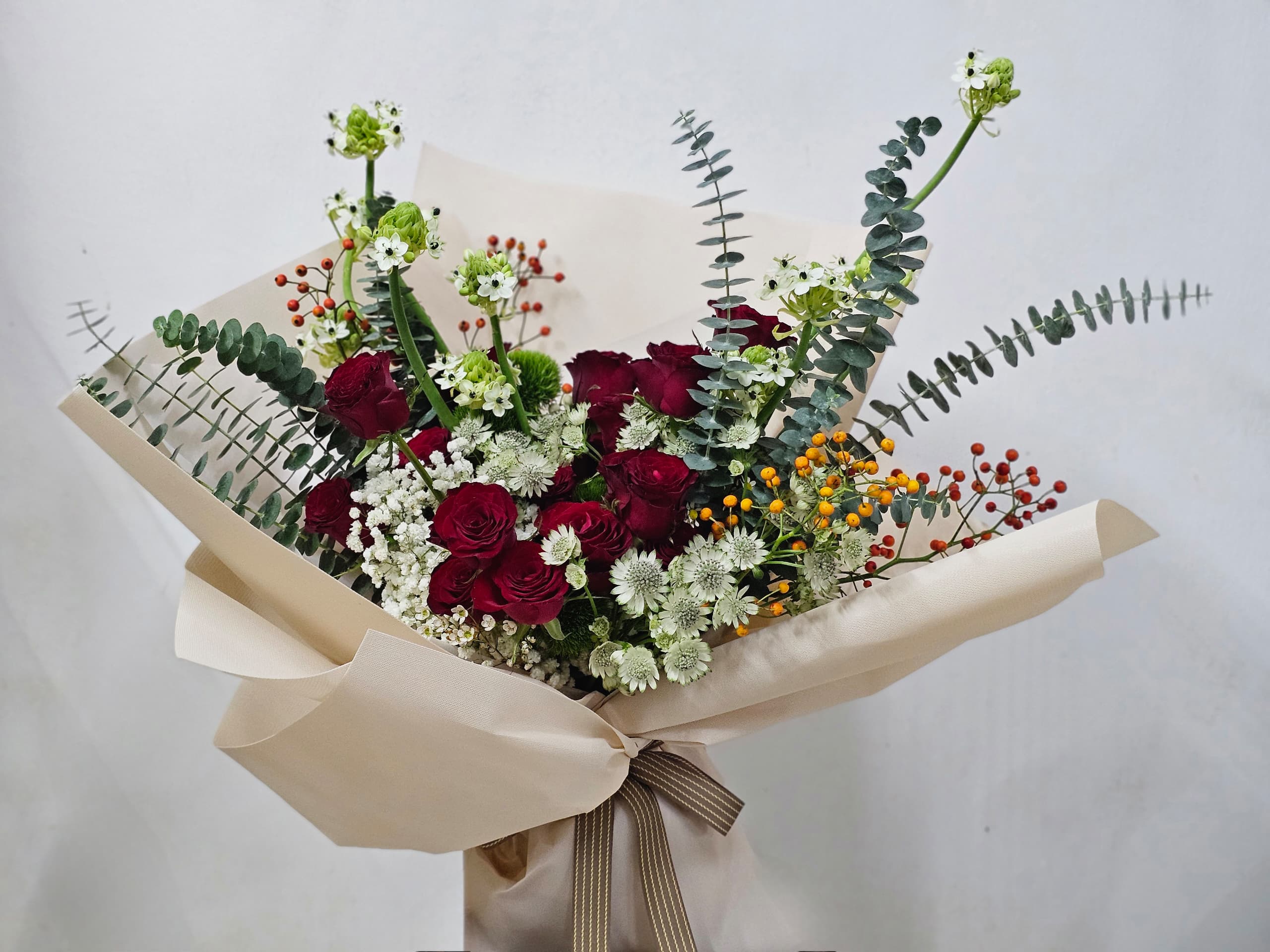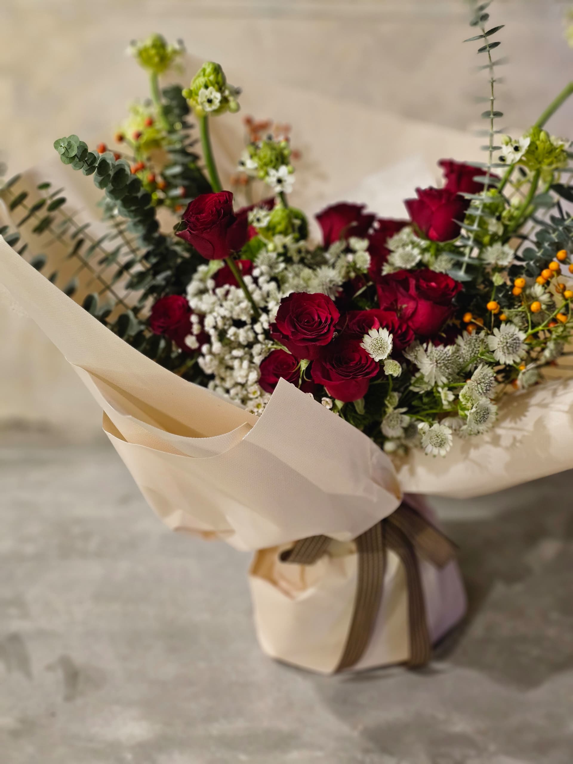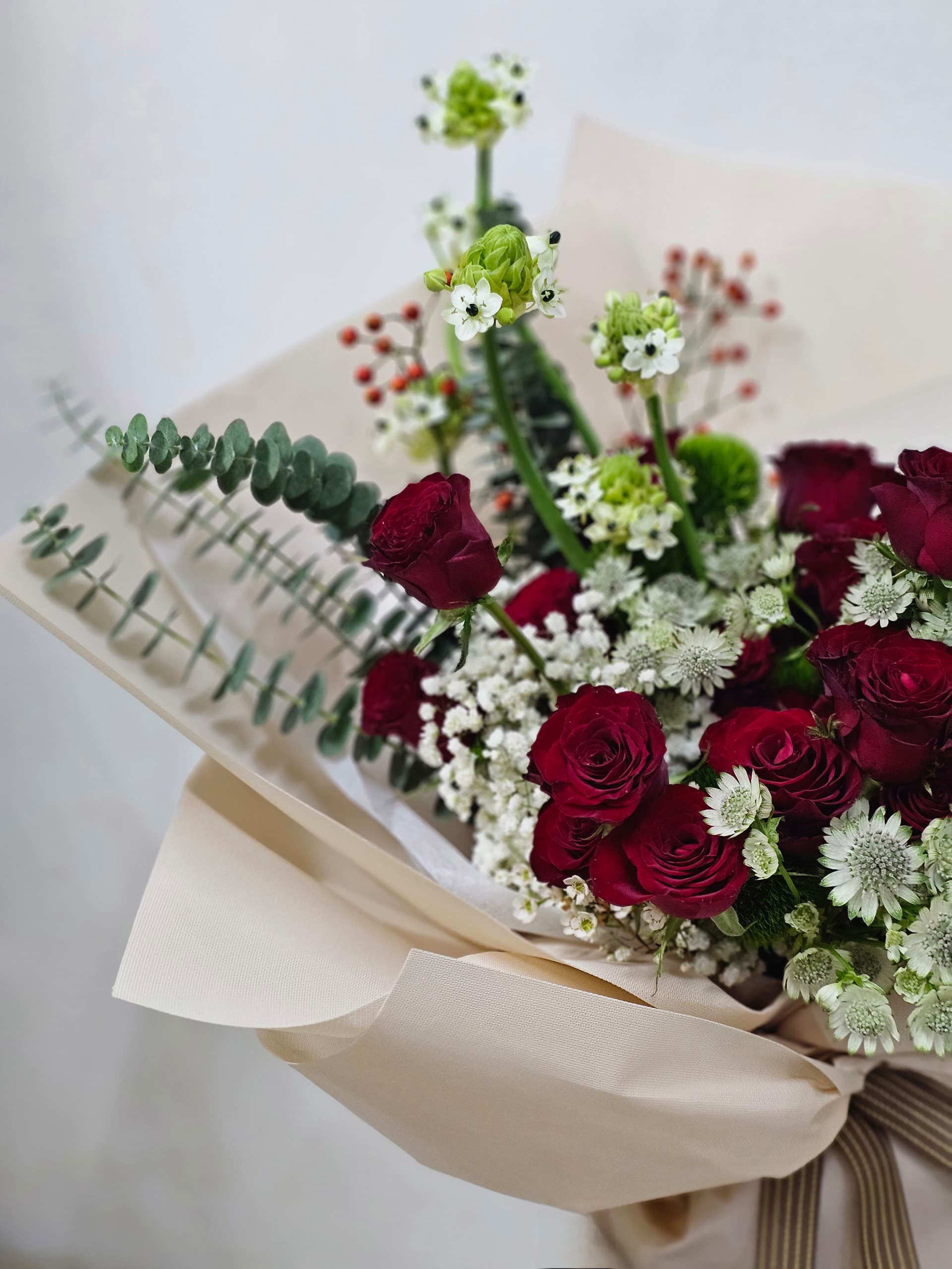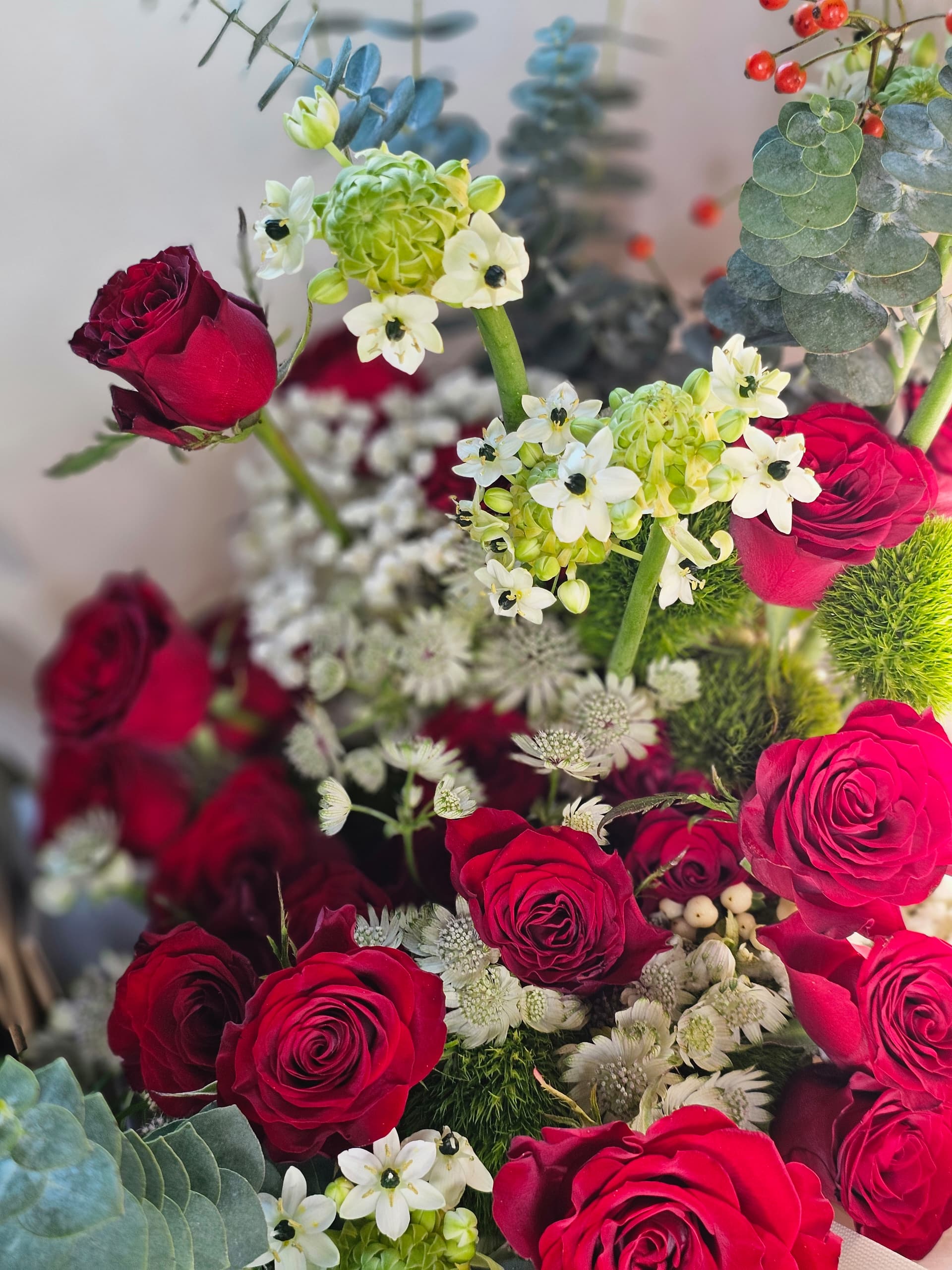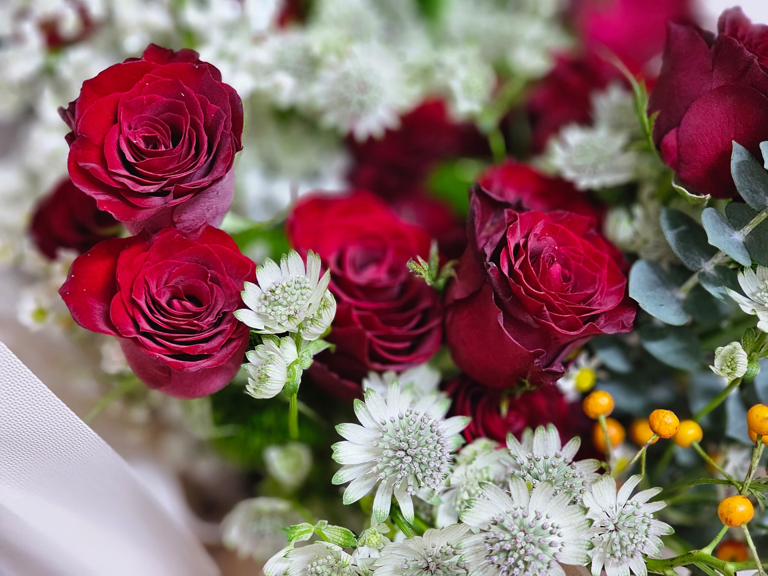 True love, symbolized by the deep red of roses, mingles beautifully with the purity of small white flowers. A love so passionate yet gentle, like these blooms, forever intertwined in beauty and grace.