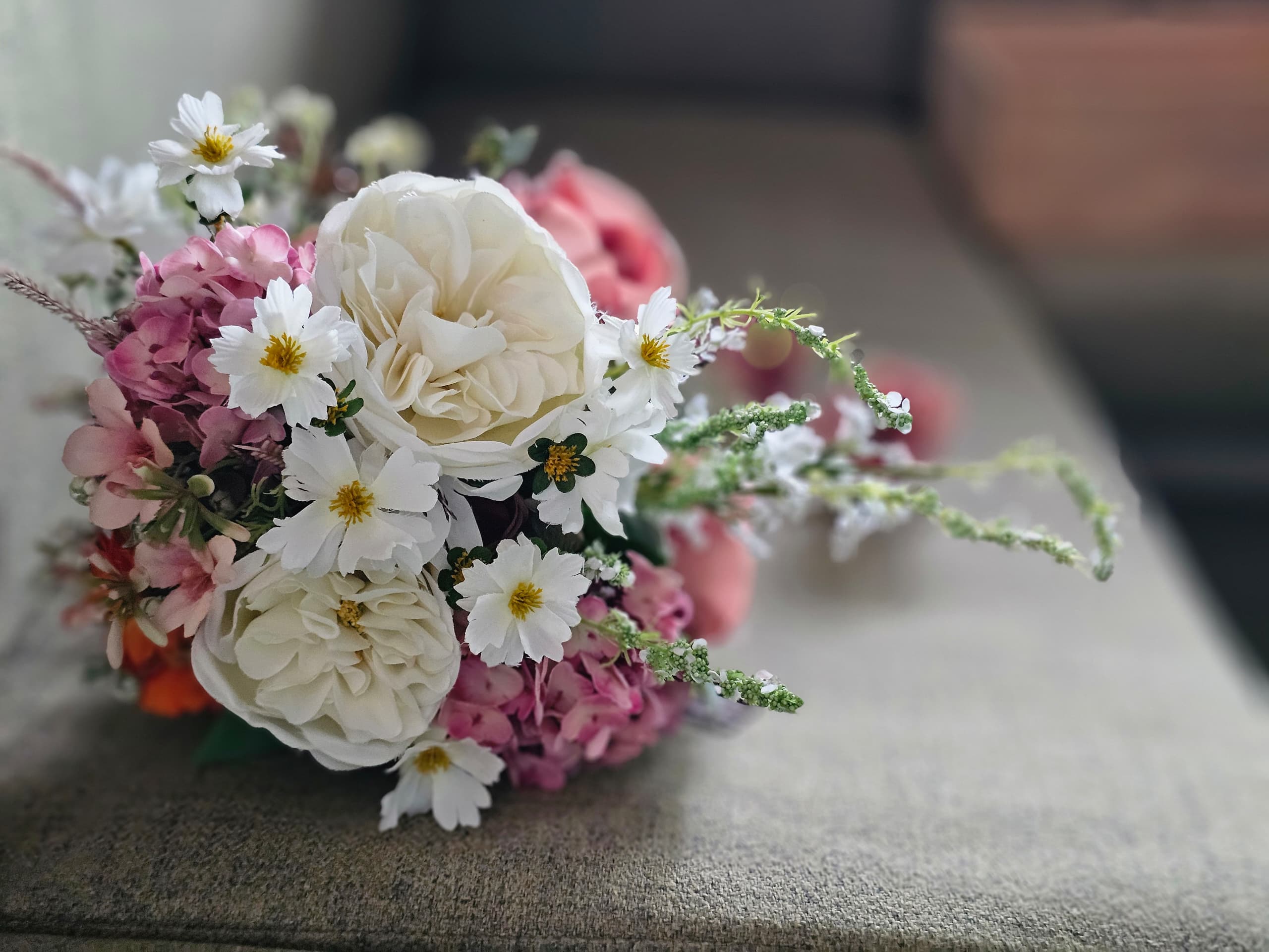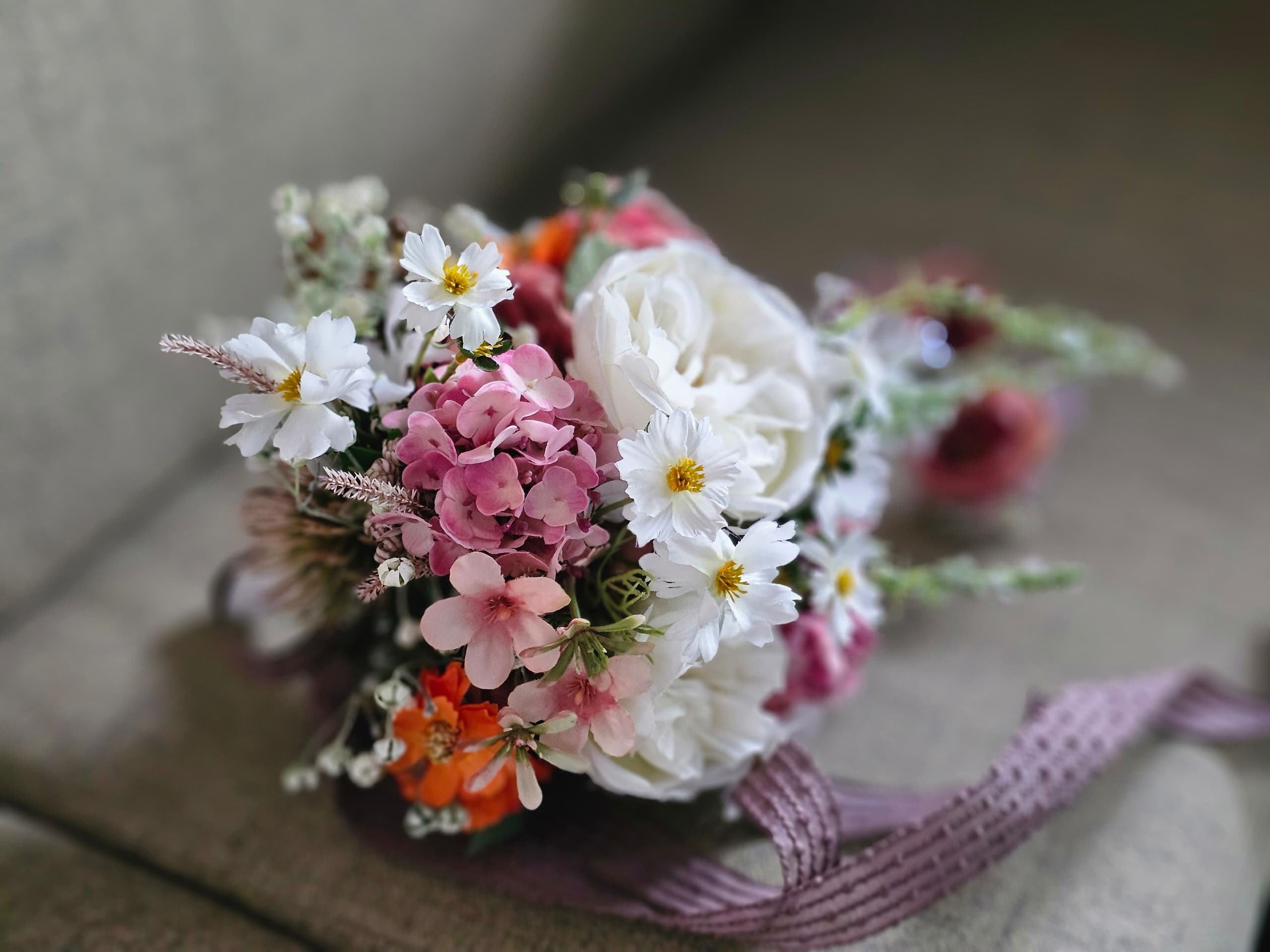 This exquisite bouquet is crafted from high-quality silk and foam flowers, featuring cream roses, tea-colored roses, hydrangeas, peach peonies, and delicate white fillers such as baby’s breath. Accentuated with white and orange cosmos, the arrangement evokes a lush, natural aesthetic with a romantic, vintage-inspired charm. Designed to maintain its fresh, vibrant appearance throughout the celebration, this timeless bouquet offers enduring beauty without the hassle of fresh flowers.